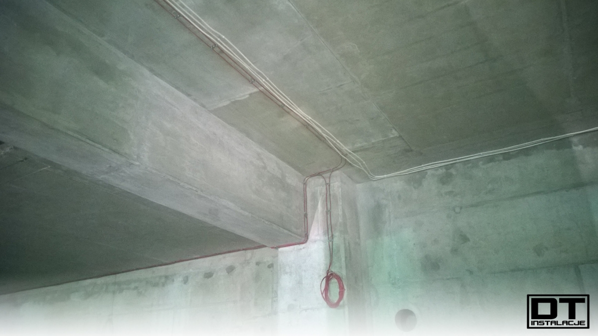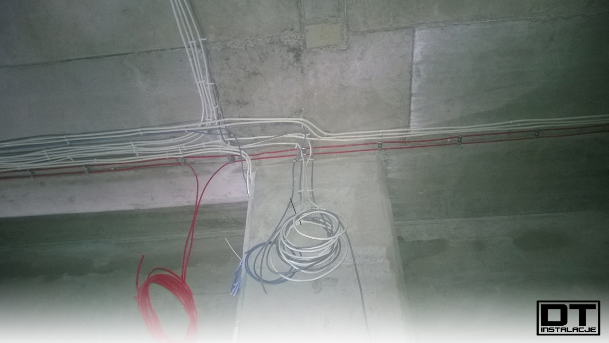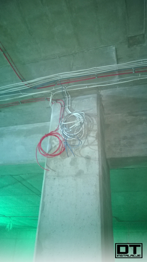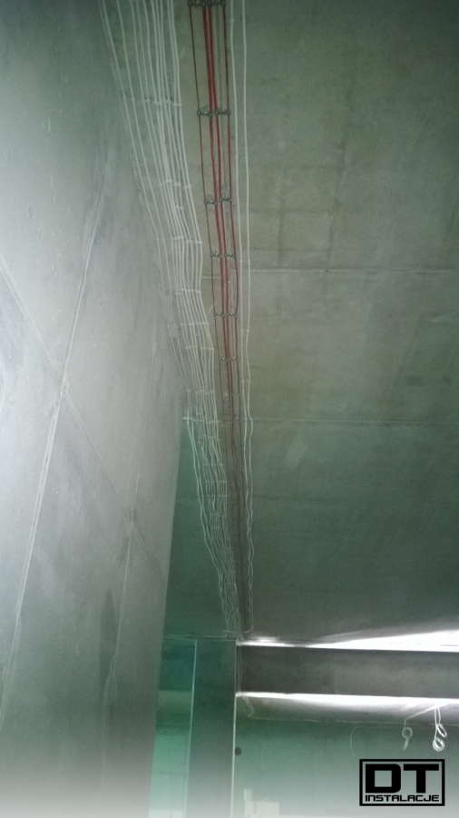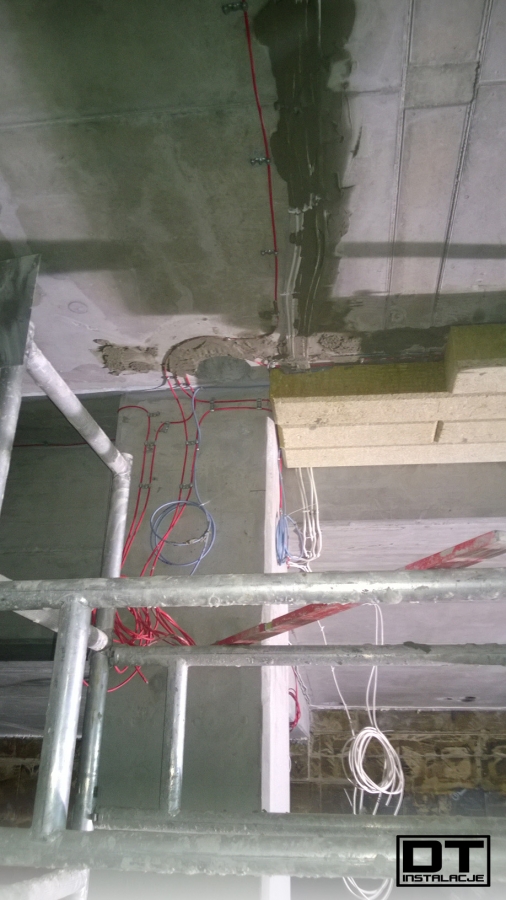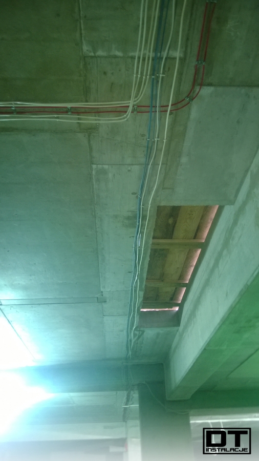 Aktualnie układamy wszystkie instalacje (BMS, instalacja elektryczna, oświetlenie, DSO oraz SSP) na stropie poziomu -1. tak, aby zdążyć przed układaniem izolacji termicznej z wełny mineralnej.